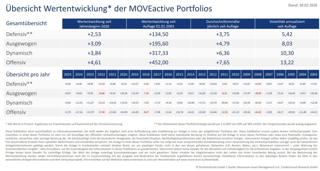 Über diesen Link gelangen Sie zur regelmäßig veröffentlichten Performanceübersicht der Moventum Portfolios sowie der jeweiligen aktuellen Marktdaten.
