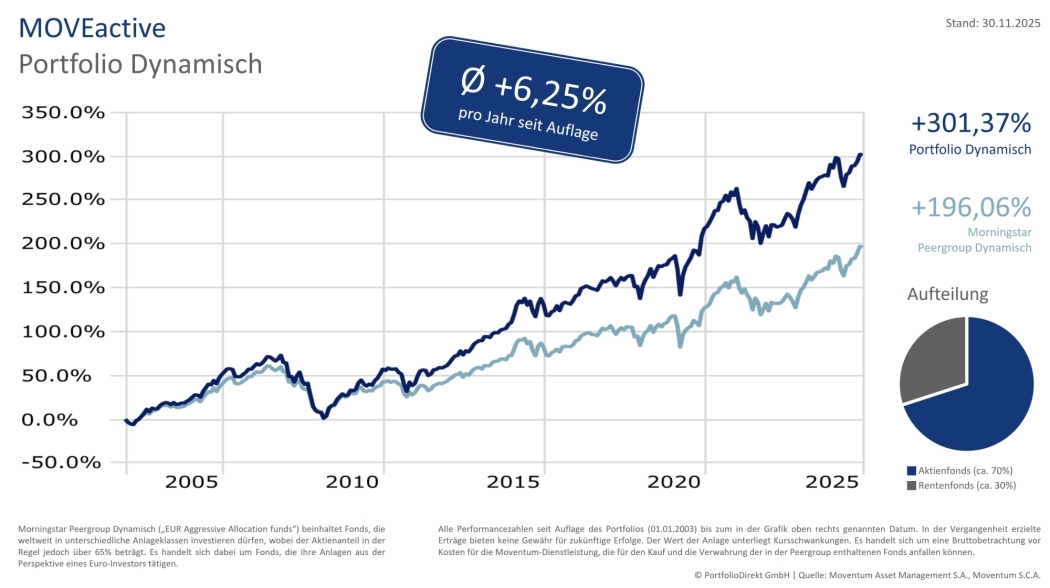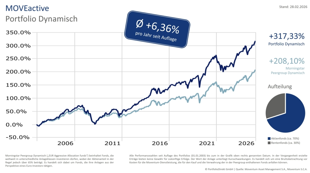 Hier erhalten Sie aktuelle Informationen zur Wertentwicklung, Zielsetzung und Zusammensetzung des MOVEactive Portfolios Dynamisch. Nachfolgendes Factsheet wird auf monatlicher Basis aktualisiert.